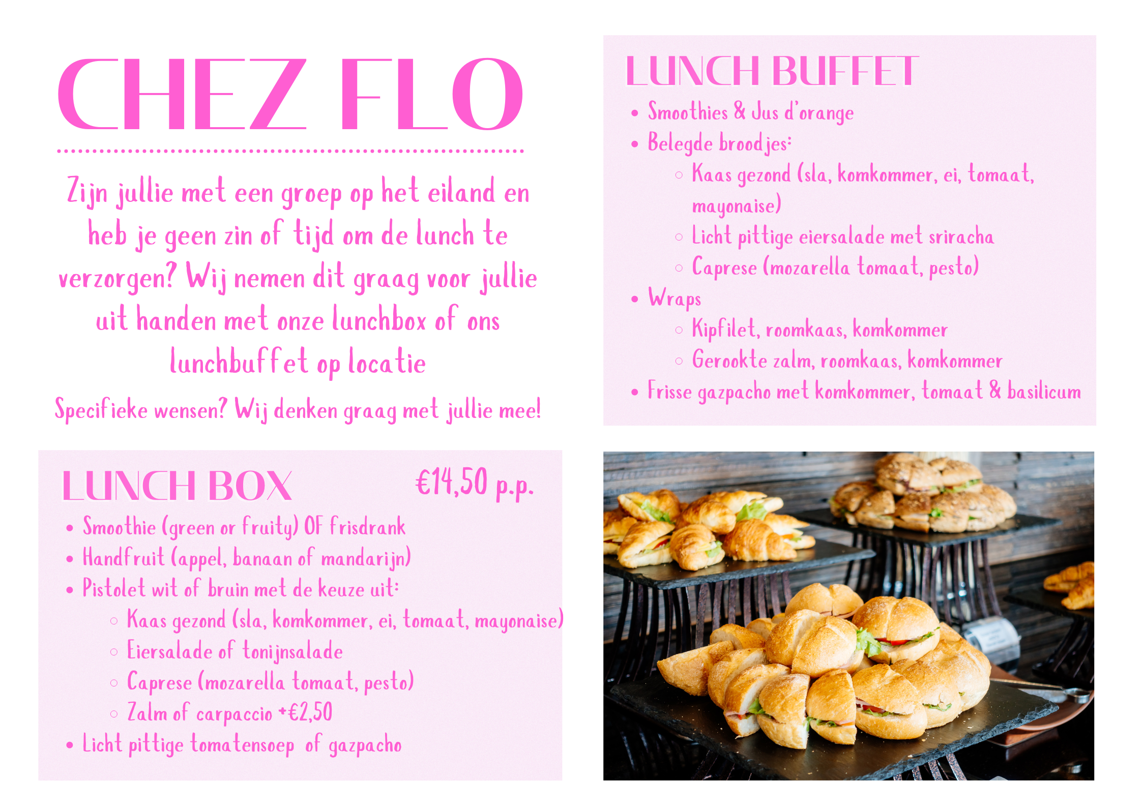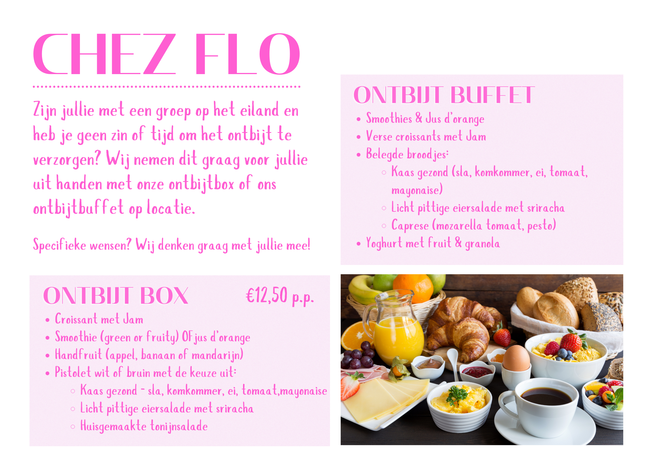 Ben jij op het eiland met jouw familie of vrienden omdat jullie iets groots te vieren hebben of omdat jullie gewoon een heerlijk weekend weg hebben? Dan heb je waarschijnlijk geen zin en tijd om zelf een ontbijt of de lunch te verzorgen voor de gehele groep. Wij nemen deze zorg graag voor jullie uit handen met onze uitgebreide lunch en ontbijtboxen of door een ontbijt of lunch buffet aan huis klaar te zetten. Bekijk hier onze opties voor ontbijt of lunch aan huis.