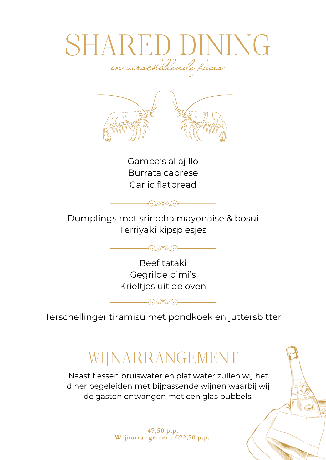 Voor kleinere groepen kunnen wij uiteraard ook een 3- of 4 gangen diner verzorgen. Zie hiervoor onze voorbeeldmenu's.